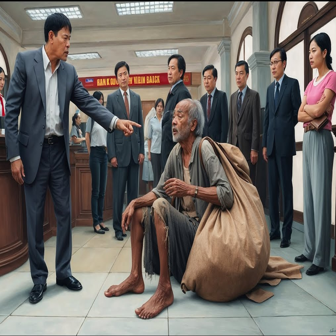Bỗng từ phía trong phòng giao dịch, một người đàn ông trung niên mặc bộ vest lịch sự bước ra. Đây là quản lý chi nhánh, nét mặt nghiêm nghị. Ông ta đi thẳng đến quầy giao dịch, ánh mắt quét qua ông lão và chiếc bao tải nặng trĩu trên sàn: “Có chuyện gì ở đây?” – giọng ông ta vang lên, khiến không gian bỗng chốc im lặng.